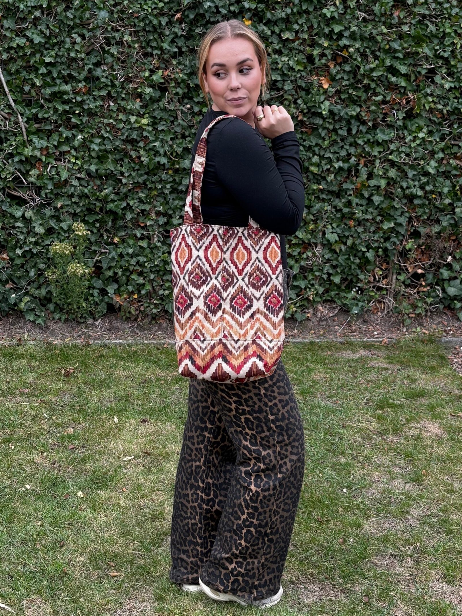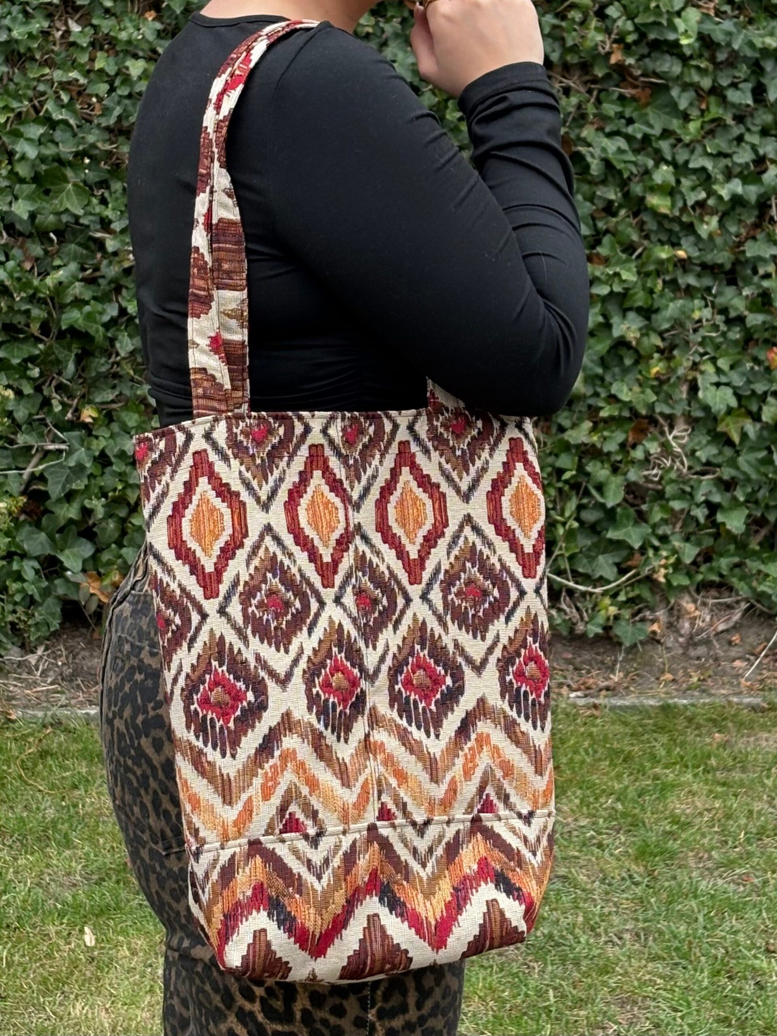 kleur: beige, bruin, rood en zacht oranje