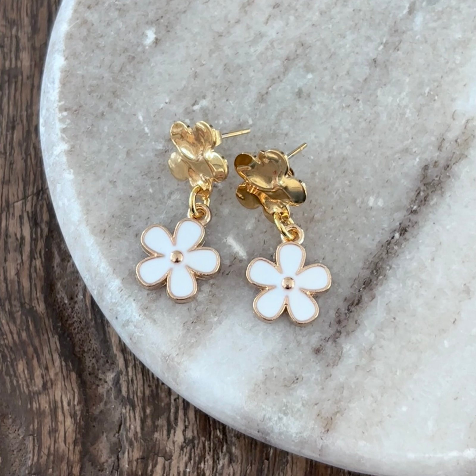 stainless steel oorbellen gold plated met witte bloem hanger